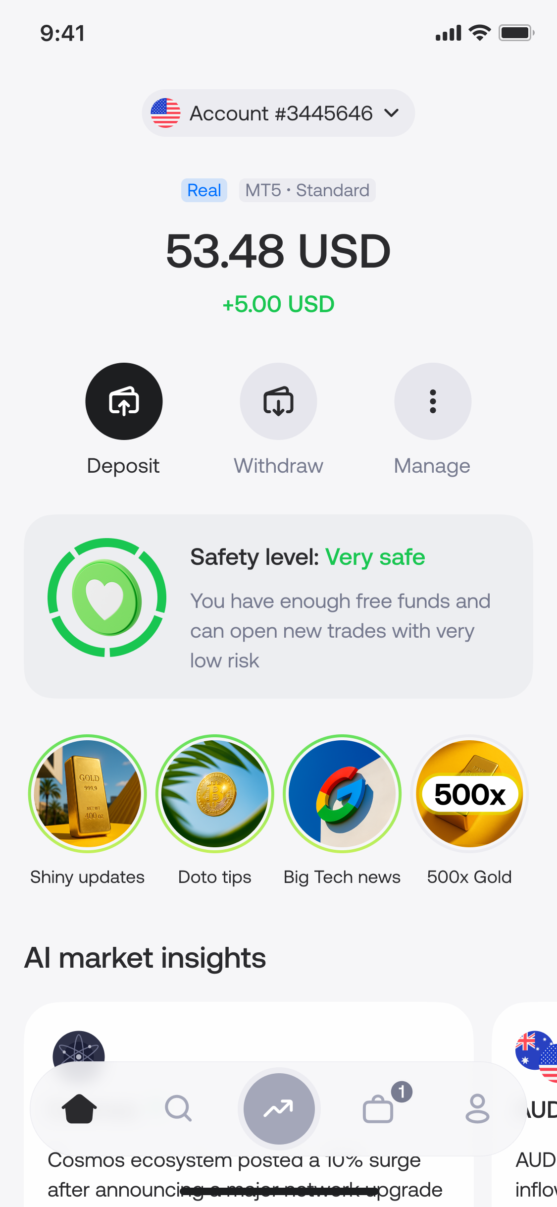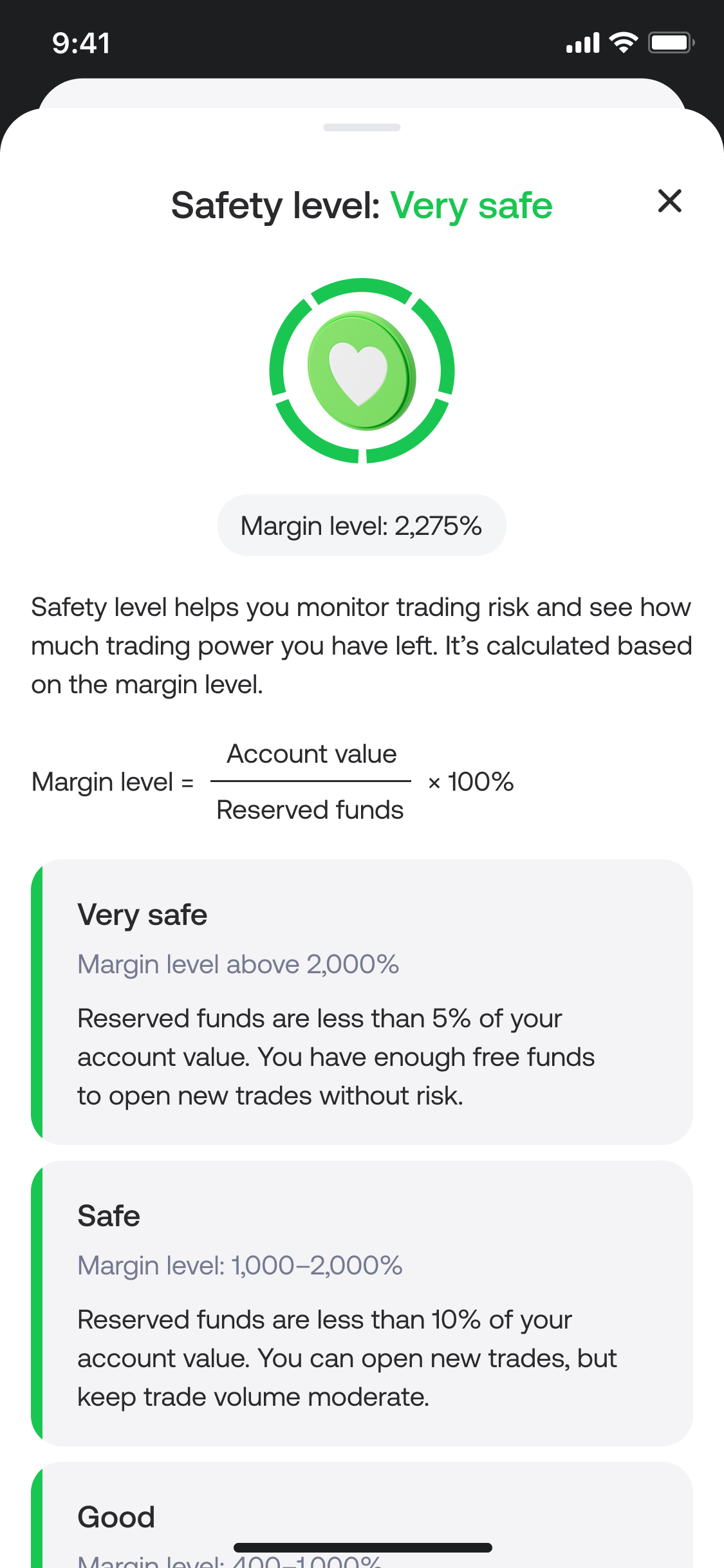 To communicate this clearly, we designed a Safety Level widget that appears in different areas of the platform. Depending on the context, the widget adapts both its content and design to give users the most relevant information at that particular stage of their trading journey.