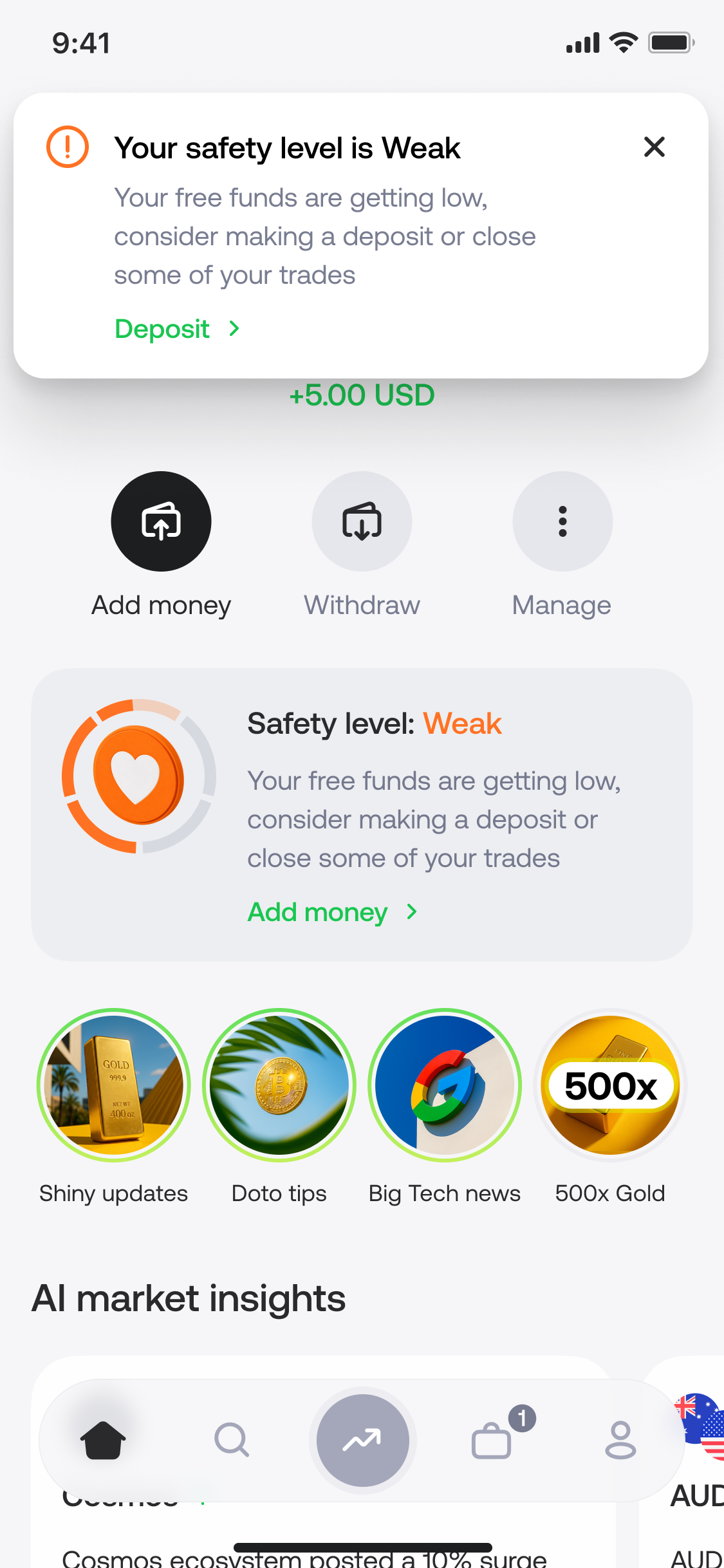 We worked closely with the analytics team to understand how much users typically deposit and how much they spend on their first trades. With the help of the engineering team, we created several Safety Levels — each one indicating how much free balance a user has left and how much they can safely allocate to a new trade.