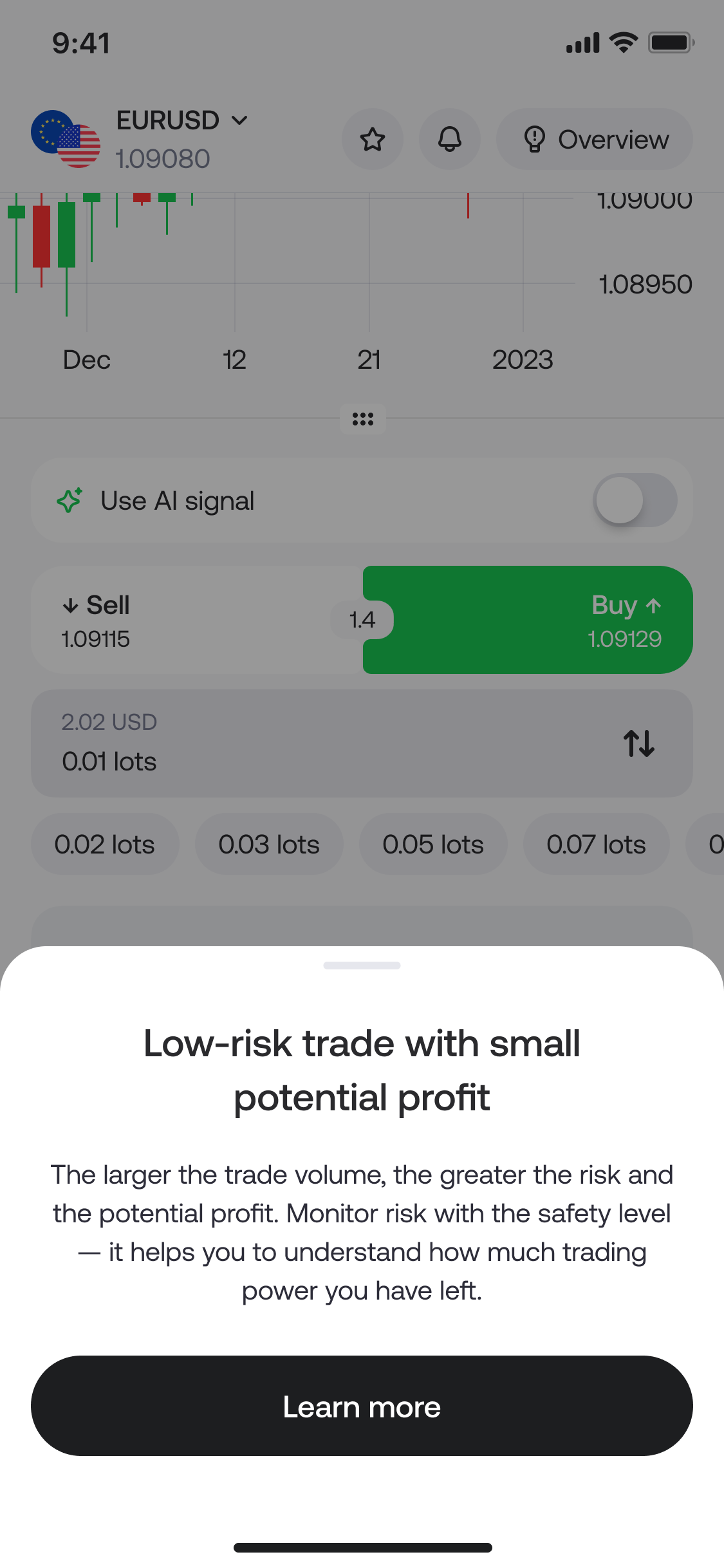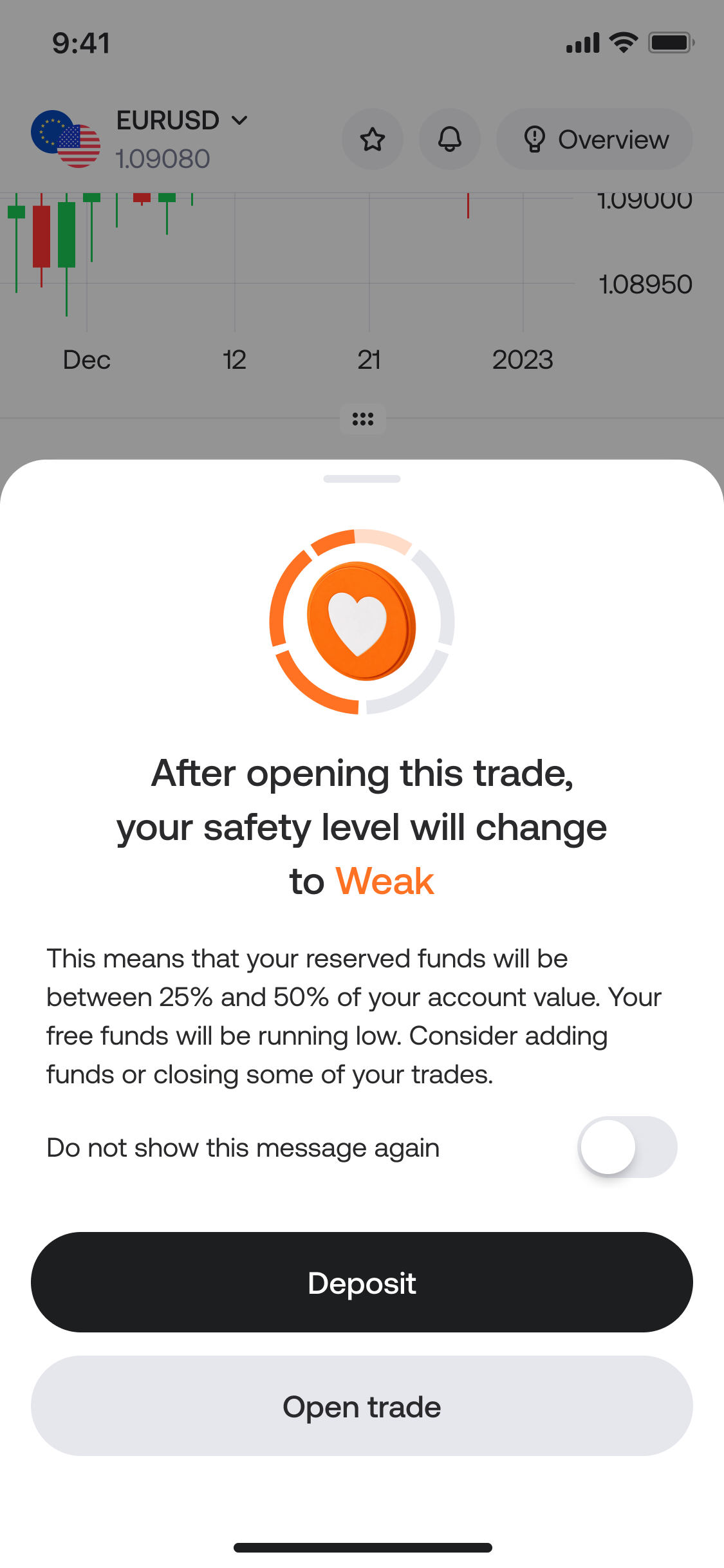 Another important challenge was finding the right balance between warning users and not discouraging them from trading. When users open a trade, it was important to also highlight the potential reward of higher-risk trades — so we designed an additional widget specifically for the trade-opening flow.